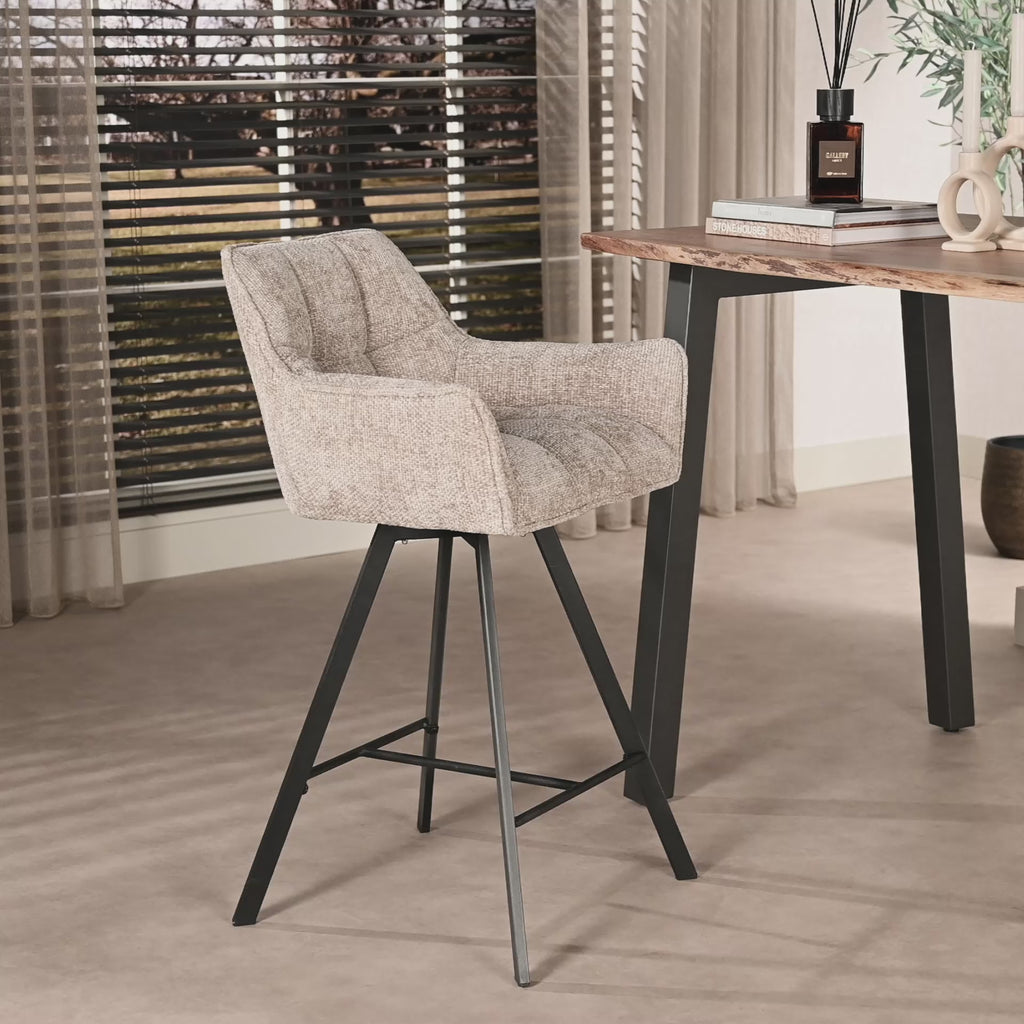 Barstoel Raster is de perfecte aanvulling voor uw interieur. Met zijn draaibare ontwerp en metalen onderstel biedt deze barstoel niet alleen stijl, maar ook functionaliteit. De stoel is bekleed met de prachtige stof in de kleur Hoven zand, wat zorgt voor een elegante uitstraling.