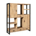 Het samenspel van massief mangohout, metalen details en ingelegde houtstroken zorgt voor een unieke uitstraling. De kast biedt zowel gesloten als open opbergruimte, ideaal voor boeken, decoratie of servies.