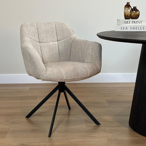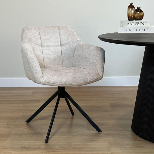 Alle gegevens bekijkenEetkamerstoel Jesse in de kleur Beige heeft een lichte, rustige uitstraling en biedt uitstekend zitcomfort. De stof voelt zacht aan en geeft de sto...