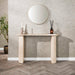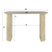 Deze tafel is uitgevoerd met een keramiek blad in travertin-look, wat zorgt voor een luxe uitstraling. Het blad rust op een opvallend frame bestaande uit twee halve manen met een wave-patroon, wat een speels en modern effect geeft.