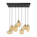 Deze eigentijdse hanglamp is een echte eye-catcher! Uitgevoerd in amber glas met 7 verschillende kapjes, biedt deze lamp een unieke uitstraling. De kapjes hebben een V dessin en zijn individueel tot 150 cm in hoogte verstelbaar, waardoor ze speels naar eigen inzicht kunnen worden opgehangen.
