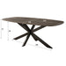 Het Deens ovalen tafelblad van 215 cm is afgewerkt met een unieke bronskleurige liquid-metal coating die een metallic uitstraling geeft. Deze bijzondere afwerking zorgt voor een rijk, warm effect dat direct opvalt in de ruimte. Het stevige spiderframe van gepoedercoat staal in bronze kleur maakt het geheel af en geeft de tafel een moderne, industriële look.