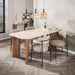 Het blad is uitgevoerd in hoogwaardig keramiek met een realistische travertin-look. Keramiek is krasbestendig, vlekwerend en bestand tegen hoge temperaturen, waardoor het ideaal is voor intensief gebruik. Het onderstel bestaat uit vier gebogen poten in een eikenhoutlook afwerking, die de tafel een stijlvolle en warme uitstraling geven.