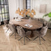 De tafel is vervaardigd uit hoogwaardig massief acaciahout, een duurzame hardhoutsoort met een warme uitstraling en natuurlijke nerven. De bruine afwerking benadrukt de diepte van het hout en geeft het geheel een luxe uitstraling.