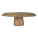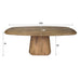 De tafel is vervaardigd uit mangohout, een duurzame houtsoort met een rijke, warme uitstraling. De matte zandkleurige afwerking benadrukt de natuurlijke nerven van het hout. De centrale poot is uitgevoerd in hetzelfde mangohout en voorzien van een uniek wave-design.