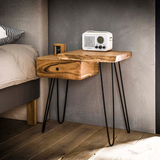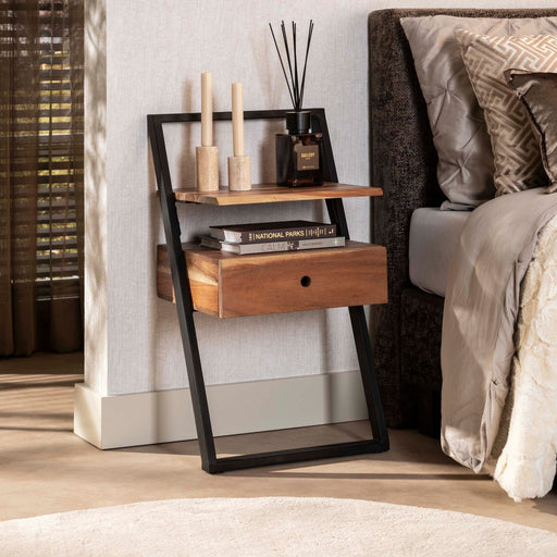 Alle gegevens bekijkenDit nachtkastje combineert stijl en functionaliteit, perfect voor elke slaapkamer. Het warme acaciahout en het bronzen metalen onderstel zorgen voo...