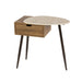 Het nachtkastje heeft bronskleurige metalen poten en een lade in eikenhoutlook. Het blad is uitgevoerd in keramiek met een travertin-look, wat zorgt voor een luxe en tijdloze uitstraling. Deze variant is ontworpen voor plaatsing rechts van het bed.